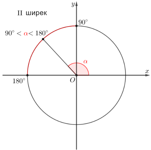 Егер \(\displaystyle 90^\circ<\alpha<180^\circ\small{}\) болса, онда координаталары \(\displaystyle (\cos(\alpha)\small{;}\sin(\alpha))\) болатын нүкте екінші координаталық ширекте орналасқан.