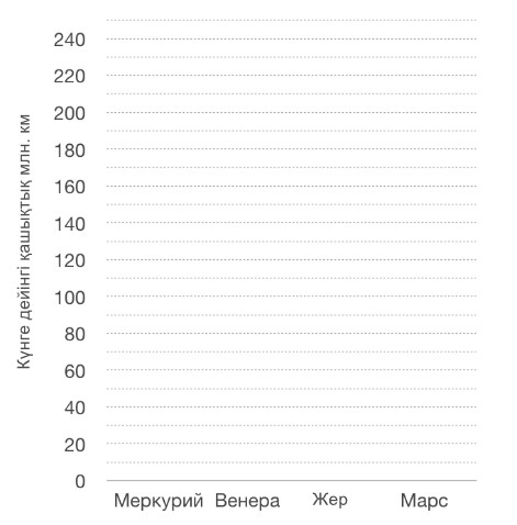 Енді әр планета атауларының үстінен бірдей кез келген ені бар тіктөртбұрыштарды (көлденеңінен) және кестеде келтірілген мәндерге, яғни сәйкес планетадан Күнге дейінгі қашықтық мәндеріне тең ұзындықтарды бейнелейік (алынған бағаналық диаграммада бұл мәндер әр тіктөртбұрыштың жанында жазылады):