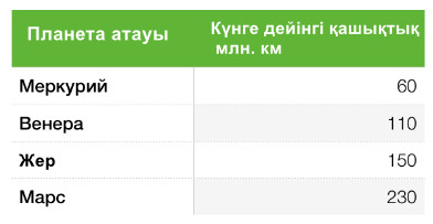 Кестеде Күн мен Күн жүйесінің кейбір планеталары арасындағы қашықтық туралы мәліметтер келтірілген