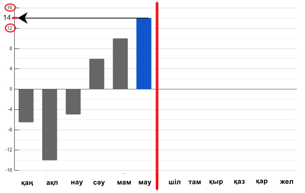 Біз температураны көрсететін осьтен таңдалған бағанның жоғарғы жағына сәйкес келетін белгіні табамыз. Ол \(\displaystyle 12\) және \(\displaystyle 16\) және мәндерінің дәл ортасында орналасқан: