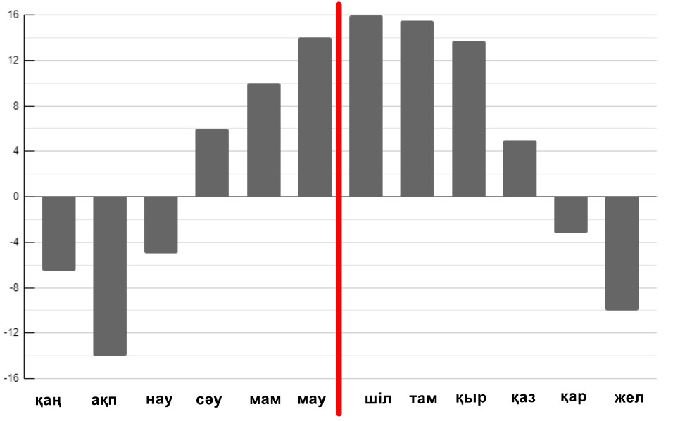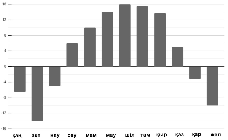 Диаграммада Атбасардағы \(\displaystyle 1994\) жылдың әр айындағы орташа айлық ауа температурасы берілген. Көлденеңінен айлар, тігінен-температура Цельсий градусымен берілген. Берілген диаграммадан \(\displaystyle 1994\) жылдың бірінші жартысындағы ең жоғары орташа айлық температураны анықтаңыз. Жауабын Цельсий градусымен беріңіз.