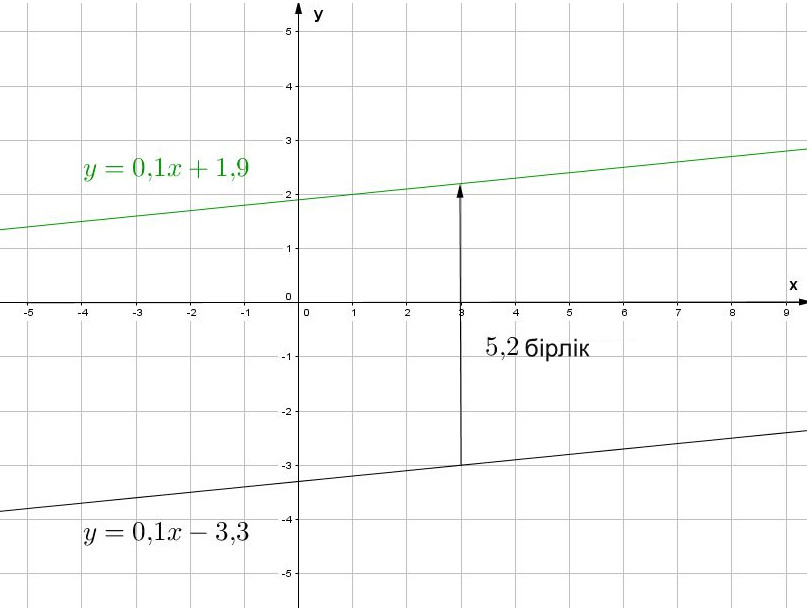 Сонда ережеге сәйкес бізде келесідей функция графигі болады \(\displaystyle y=(\color{green}{ 0{,}1x-3{,}3})+\color{blue}{ 5{,}2}=0{,}1x+1{,}9{\small . } \)