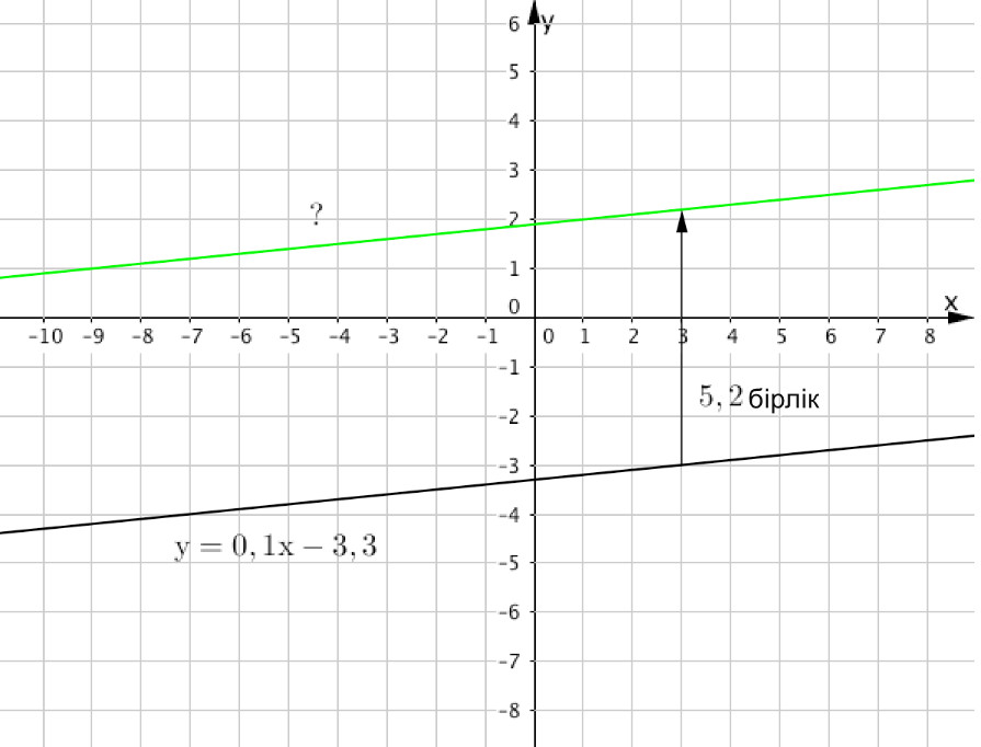 Бізге \(\displaystyle y=\color{green}{ 0{,}1x-3{,}3}{\small } \) функциясының графигі берілген және біз оны \(\displaystyle \color{blue}{ 5{,}2}\) бірлікке көтереміз.
