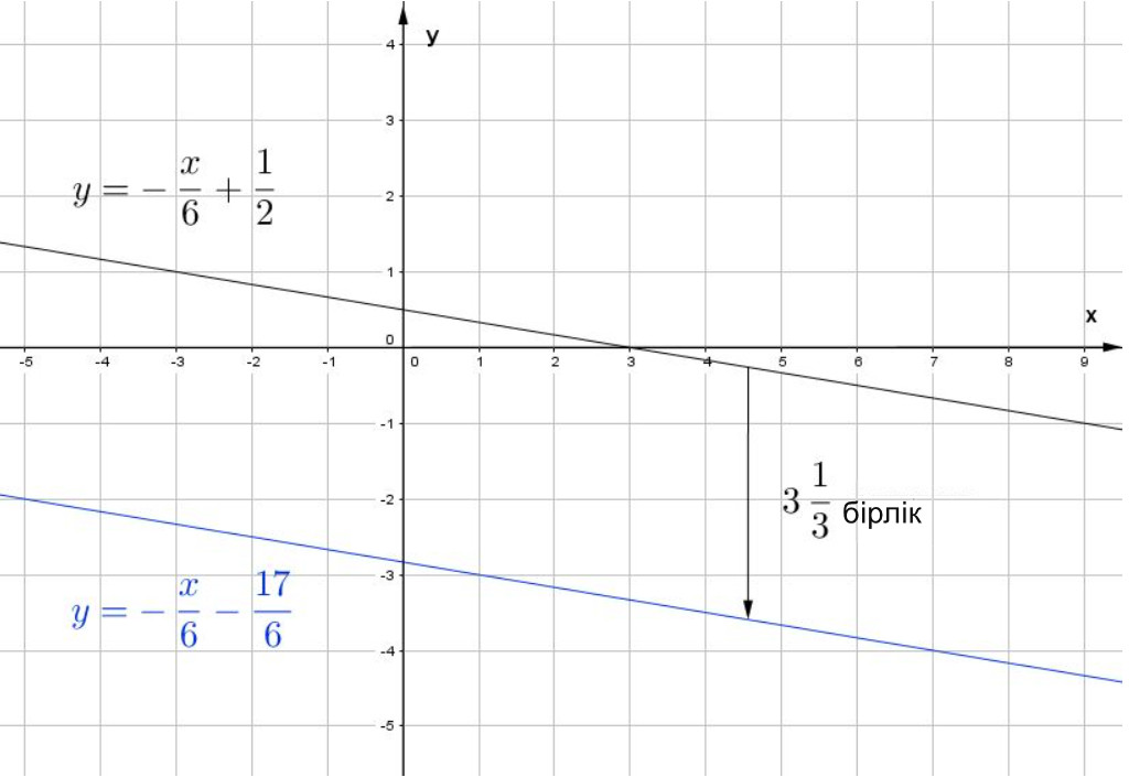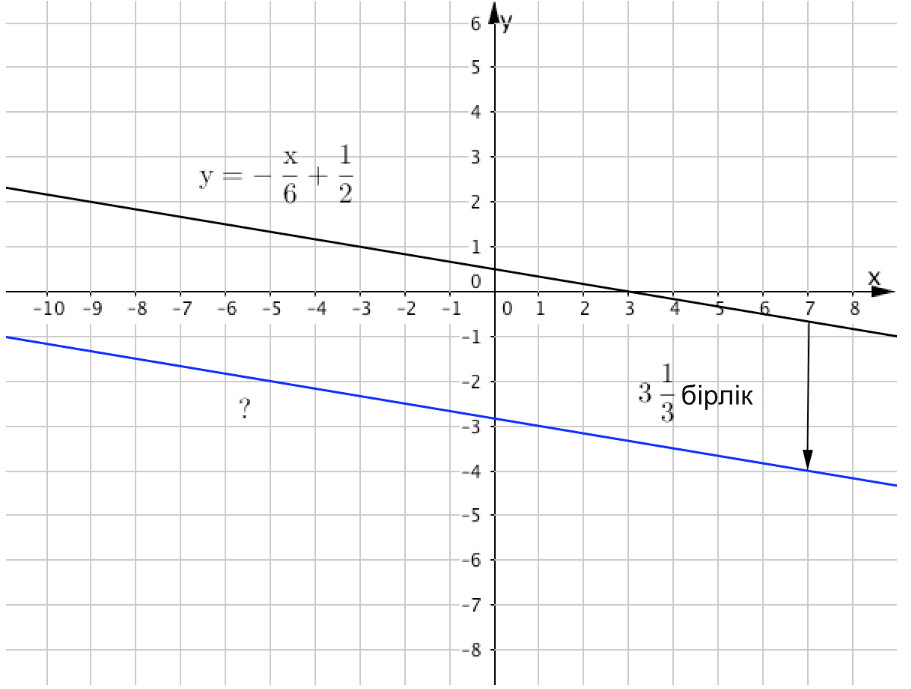 \(\displaystyle y=-\frac{x}{6}+\frac{1}{2}\) түзуін \(\displaystyle 3\frac{1}{3}\) бірлікке төмен жылжыту арқылы алынған түзудің теңдеуін жазыңыз (\(\displaystyle \rm OY\) осі бойымен).