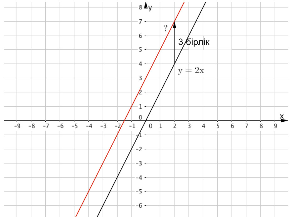\(\displaystyle y=2x\) түзуін \(\displaystyle 3\)бірлікке жоғары жылжыту арқылы алынған түзудің теңдеуін жазыңыз (\(\displaystyle \rm OY\) осі бойымен).