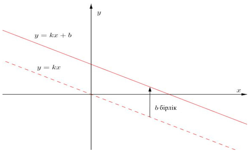 Берілген \(\displaystyle y=kx+b \) түзуі \(\displaystyle y=kx\,{\small } \) түзуін \(\displaystyle b \) бірлікке жоғары жылжыту арқылы алынған: