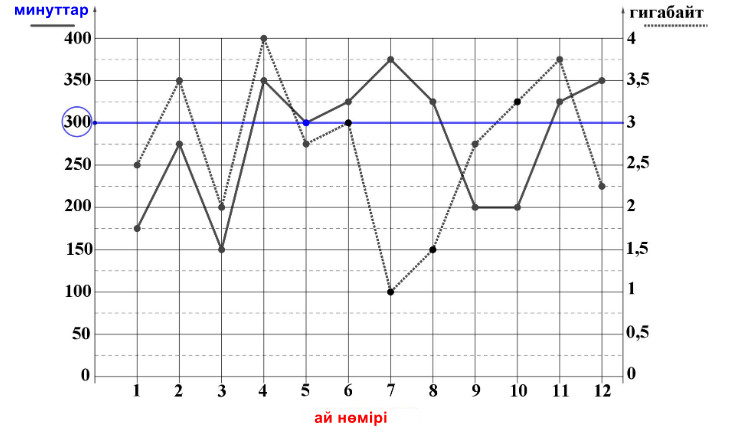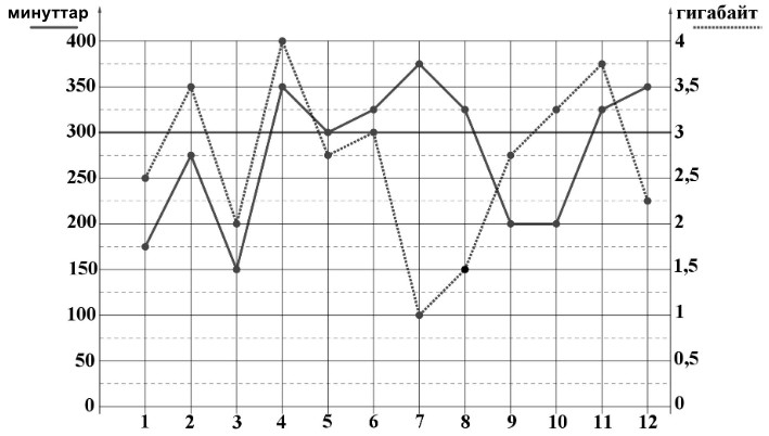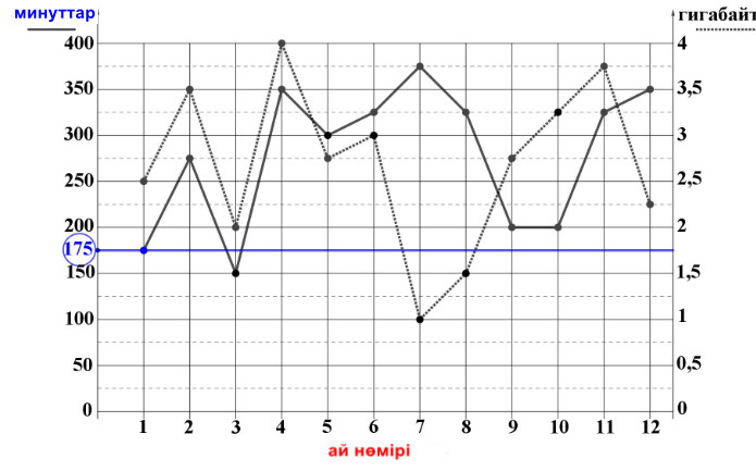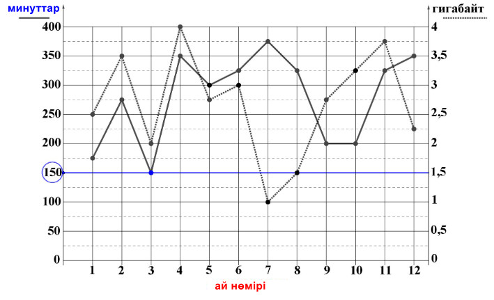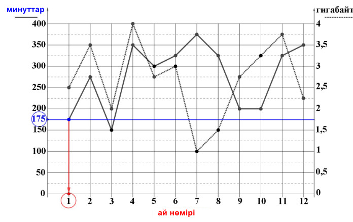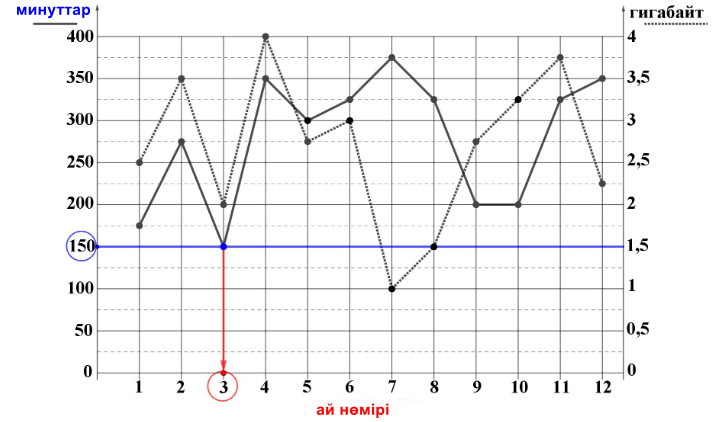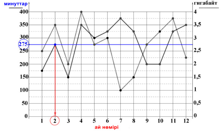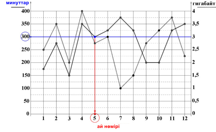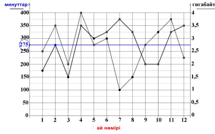 Суретте нүктелермен абонент смартфонды пайдалану процесінде \(\displaystyle 2019\) жылдың әр айы үшін шығыс қоңыраулар минуттарының саны және гигабайттағы мобильді интернет трафигі көрсетілген. Ыңғайлы болу үшін минуттар мен гигабайттарға сәйкес келетін нүктелер сәйкесінше тұтас және нүктелі сызықтармен қосылған.