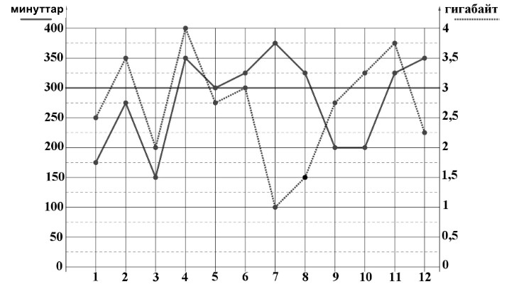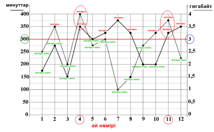 - абонент \(\displaystyle 3\) гигабайттан астам мобильді интернетті жұмсаған айлар көлденең сызықтан жоғары орналасқан нүктелі сынықтың төбелеріне сәйкес келеді.