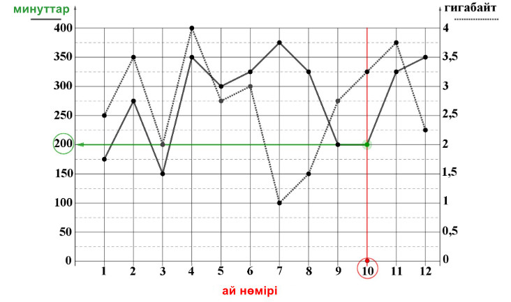 Есептің шарты бойынша шығыс қоңыраулардың минуттар санына сәйкес келетін нүктелер тұтас сызықпен қосылған, сондықтан шешімі кезінде тек тұтас сынықты қолданамыз.
