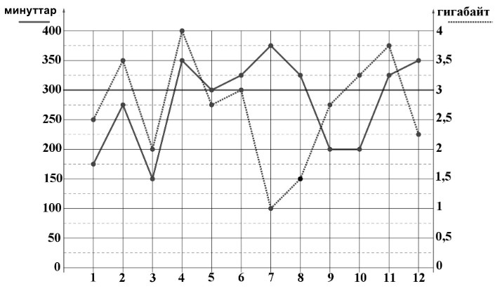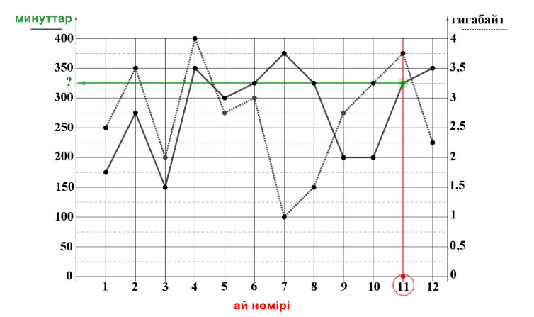 Суретте нүктелермен абонент смартфонды пайдалану процесінде \(\displaystyle 2019\) жылдың әр айы үшін кеткен шығыс қоңыраулар минуттарының саны және гигабайттағы мобильді интернет трафигі көрсетілген. Ыңғайлы болу үшін минуттар мен гигабайттарға сәйкес келетін нүктелер сәйкесінше тұтас және нүктелі сызықтармен қосылған.
