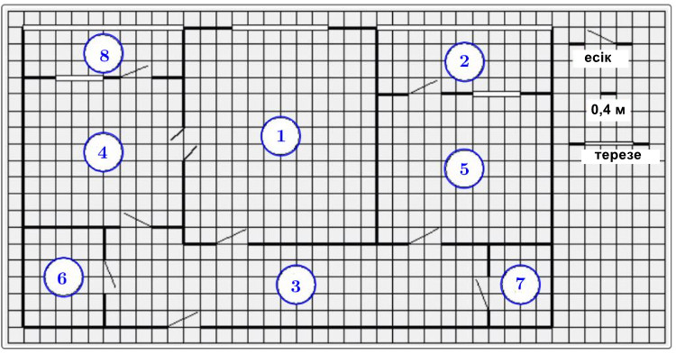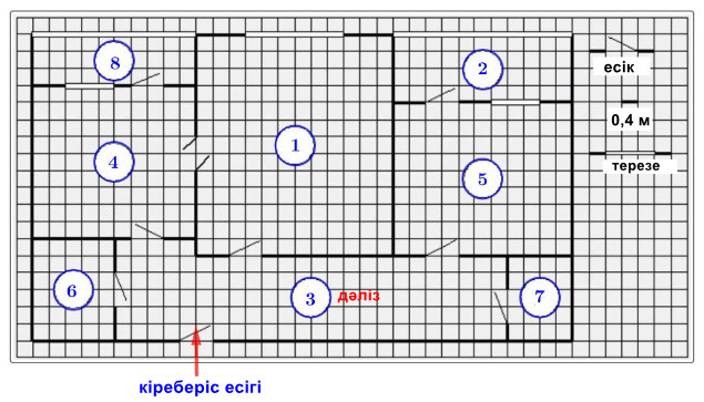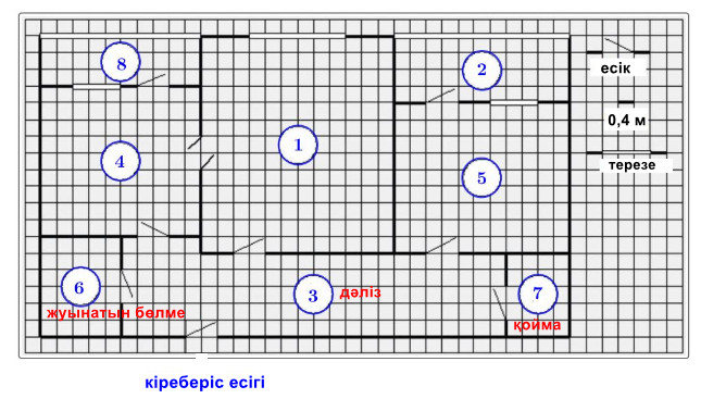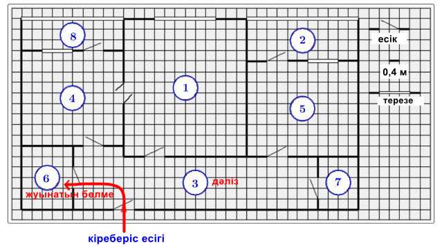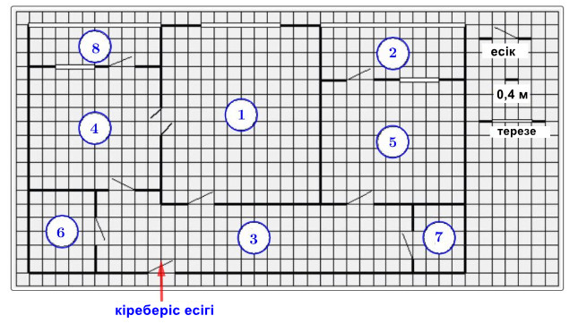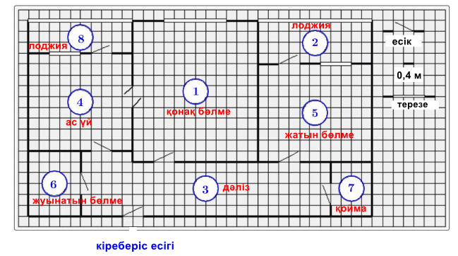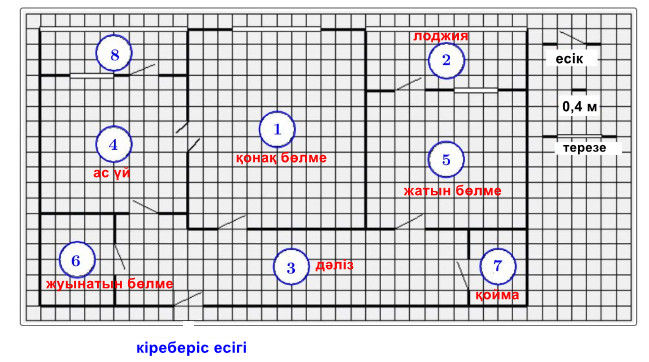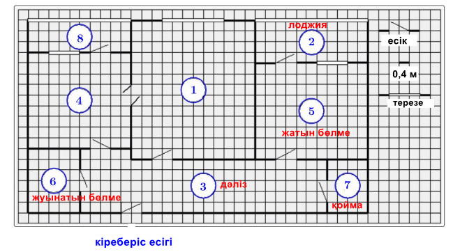 Суретте көп қабатты тұрғын үйдегі екі бөлмелі пәтердің жоспары көрсетілген. Жоспардағы бір ұяшықтың қабырғасы \(\displaystyle 0{,}4\)м-ге сәйкес келеді, ал есік пен терезенің шартты белгілері суреттің оң жағында көрсетілген.