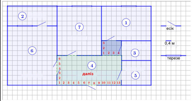 Суретте көп қабатты тұрғын үйдегі екі бөлмелі пәтердің жоспары көрсетілген. Жоспардағы бір ұяшықтың қабырғасы \(\displaystyle 0{,}4\)м сәйкес келеді.