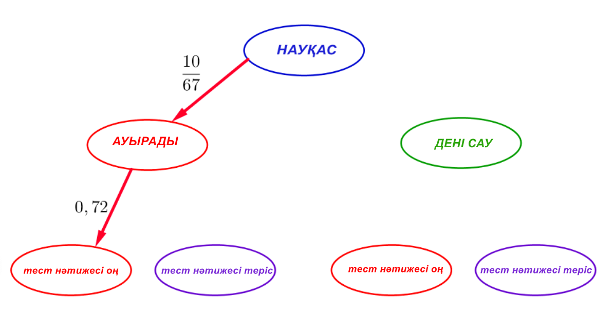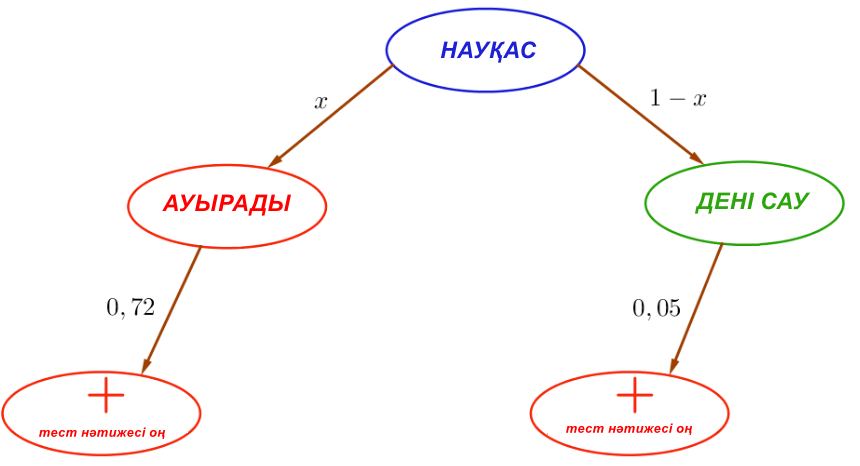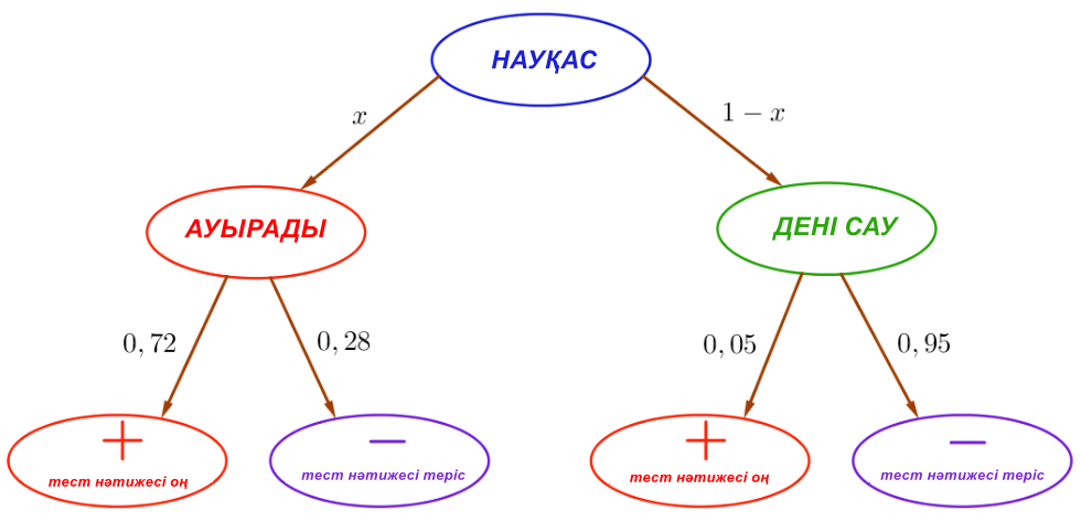 - Науқас ауырса, тесттің оң шығу ықтималдығы \(\displaystyle 0{,}72\small\) тең. Демек, науқас адамда теріс сынақтың ықтималдығы \(\displaystyle 1-0{,}72=0{,}28\small\) тең.