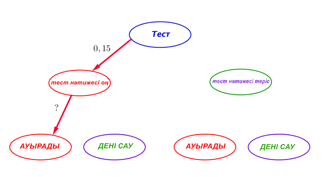 - Егер науқас сау болса, сынақ нәтижесі \(\displaystyle 0{,}95\small\) ықтималдығымен теріс болады, сондықтан сау адамда оң сынақтың ықтималдығы \(\displaystyle 1-0{,}95=0{,}05\small.\)