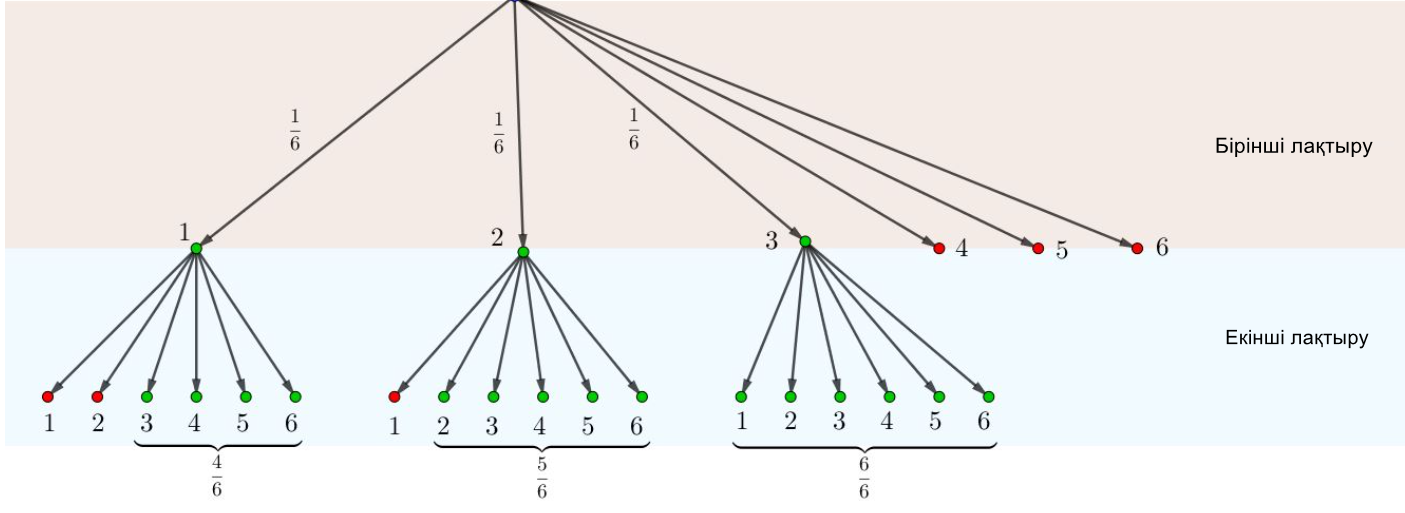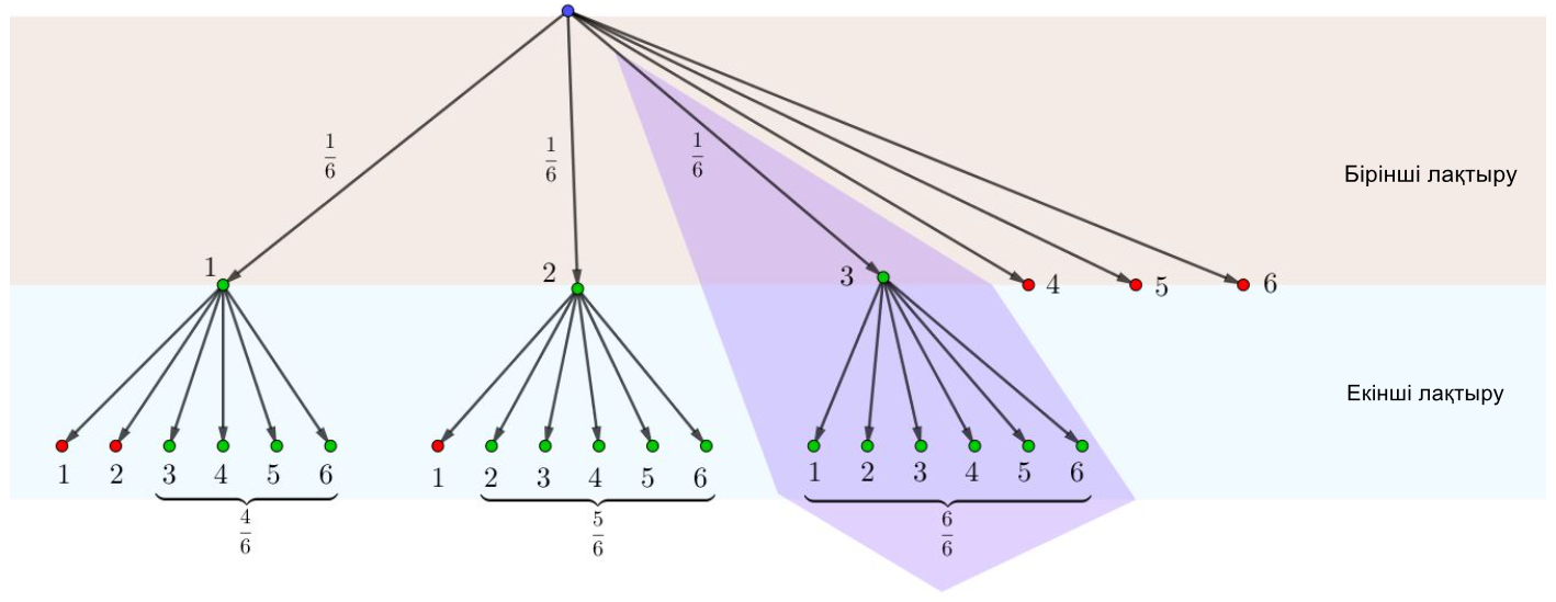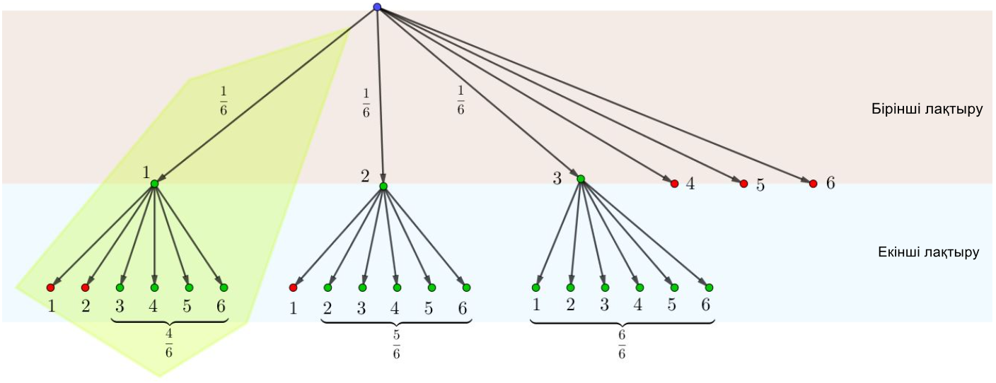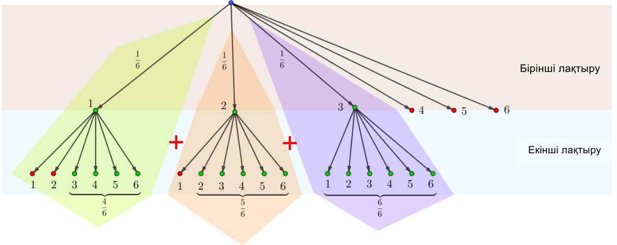 \(\displaystyle P(\)бірінші ақтыруда \(\displaystyle 1\) ұпай түсті және қосындысы артық \(\displaystyle 3)=P(B_{1}) \cdot P_{B_{1}}(A)=\frac{1}{6}\cdot\frac{4}{6}=\frac{4}{36}{\small . }\)