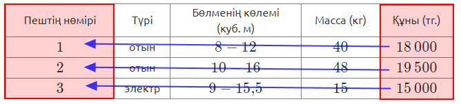 | Пештің нөмірі | Түрі | Бөлменің көлемі (куб. м) | Масса (кг) | Құны (тг.) |