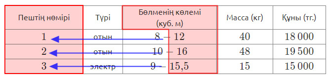 | Пештің нөмірі | Түрі | Бөлменің көлемі (куб. м) | Масса (кг) | Құны (тг.) |