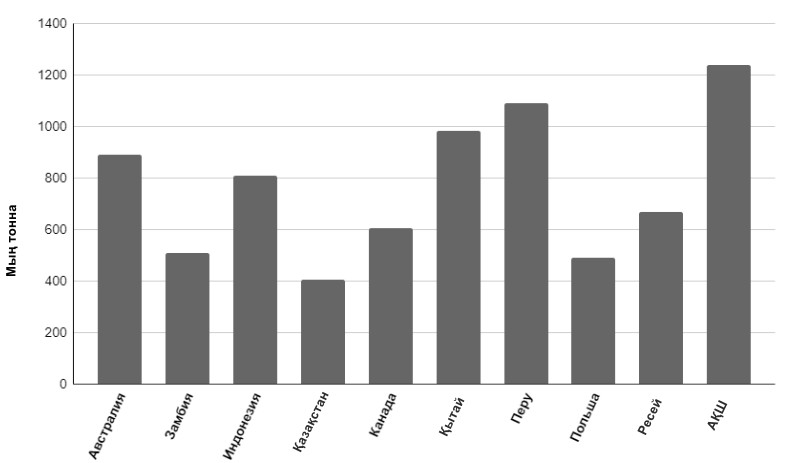 Диаграммада \(\displaystyle 2006\) жыл ішінде \(\displaystyle 10\) әлем елдерінде (мың тонна) мыс балқытудың таралуы көрсетілген. Ұсынылған елдер арасында Мыс балқыту бойынша бірінші орынды АҚШ, оныншы орынды Қазақстан иеленді. Канада қандай орын алды?