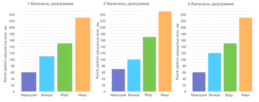 - олардың ұзындықтары кестеде келтірілген сәйкес мәндерге, яғни тиісті планетадан Күнге дейінгі арақашықтық мәндеріне тең (бағаналы диаграммада алынған әр тіктөртбұрыштың жанында бұл мәндерге қол қойылған).