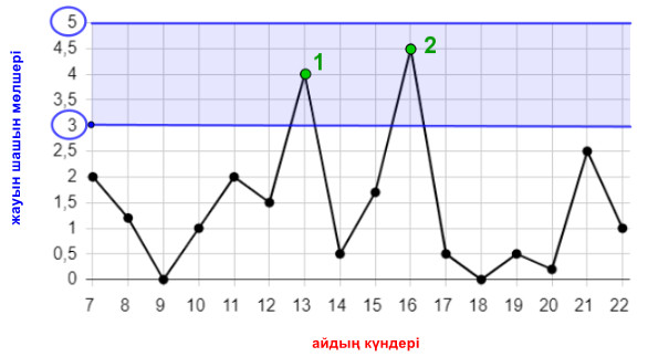 \(\displaystyle 3\) миллиметрден \(\displaystyle 5\) миллиметрге дейін жауын-шашын түскен күндер осы сызықтардың арасында немесе сол сызықтарда жатқан нүктелерге сәйкес келеді.
