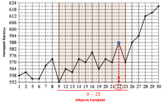 Суретте қалың нүктелермен Қазақстан Республикасының Халық банкіқазан айында \(\displaystyle 2010\) барлық жұмыс күндері белгілеген палладийдің бағасын көрсеткен. Көлденеңінен айдың нөмірлері, тігінен палладийдің бағасы грамына теңгемен көрсетіледі. Түсінікті болу үшін суреттегі қалың нүктелер сызықпен жалғанған. \(\displaystyle 9\) мен \(\displaystyle 23\) қазан аралығында палладийдің бағасы қай санның суретін анықтаңыз.
