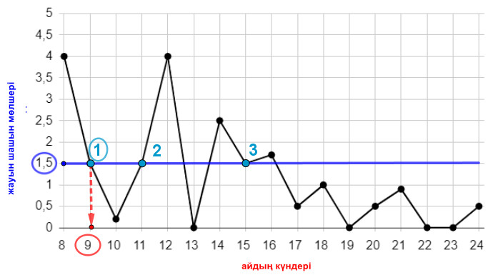 Алғаш рет дәл \(\displaystyle 1{,}5\) миллиметр жауын-шашын түскен күн \(\displaystyle 1\) нөмірлі нүктеге сәйкес келеді.