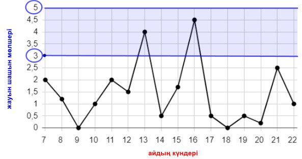 Осылайша, \(\displaystyle 3\) миллиметрден \(\displaystyle 5\) миллиметрге дейін жауын-шашын көрсетілген кезеңде \(\displaystyle 2\) күн болды.