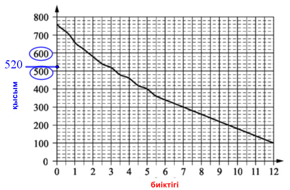 Сынап бағанының \(\displaystyle 520\) миллиметріне атмосфералық қысым қандай биіктікте тең болатынын графиктен анықтау керек. Яғни, тік осьтегі \(\displaystyle 520\) мәнге сәйкес келетін көлденең осьтегі мәнді жауапта көрсету керек.