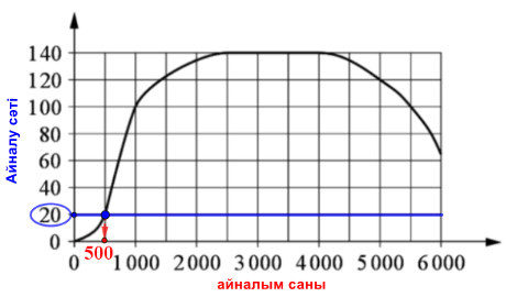Графикте автомобиль қозғалтқышының айналу сәтінің оның минутына айналу санына тәуелділігі көрсетілген. Абсцисса осінде минутына айналым саны қойылады. Ординат осінде Н\(\displaystyle \cdot \)м дағы айналу сәті. Автокөлік қозғалысты бастауы үшін айналу сәті \(\displaystyle 20\) Н\(\displaystyle \cdot \) м-ден кем болмауы керек. Көлік құралының қозғалысын бастау үшін минутына ең аз қозғалтқыш айналымының қайсысы жеткілікті екенін графиктен анықтаңыз?