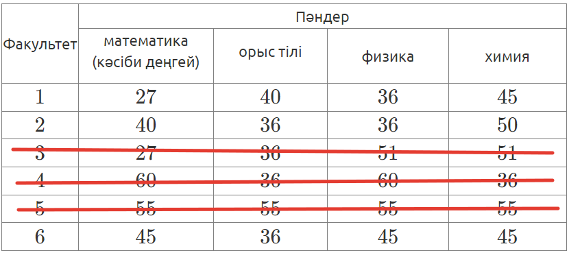 ҰБТ талапкер алған ұпайларды ретімен алып, құжаттарды тапсыруға болмайтын факультеттерді кестеден сызып тастайтын боламыз.