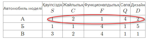 Автомобиль журналы қауіпсіздік \(\displaystyle S\) жайлылық \(\displaystyle C {\small ,}\) функционалдылық \(\displaystyle F{\small ,}\) сапа \(\displaystyle Q\) және дизайн \(\displaystyle D{\small }\) көрсеткіштеріне негізделген автомобильдердің рейтингін анықтайды