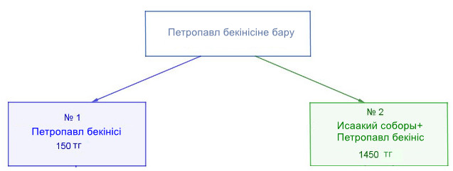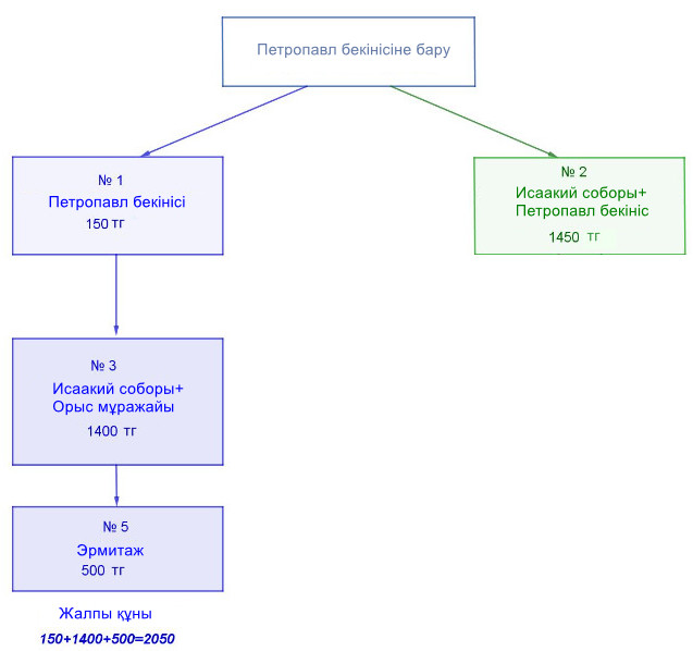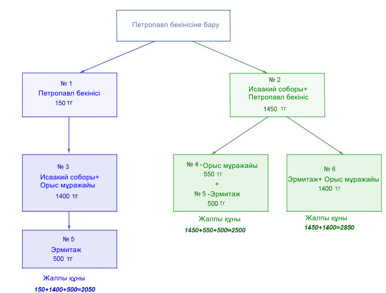 Санкт-Петербургке келген турист \(\displaystyle 4\) мұражайға барғысы келеді: Эрмитаж, Орыс мұражайы, Петропавл бекінісі және Исаакий соборы. Экскурсиялық кассалар бір немесе бірнеше объектілерге баратын бағыттарды ұсынады. Билеттер мен бағыттардың құны туралы мәліметтер кестеде келтірілген.