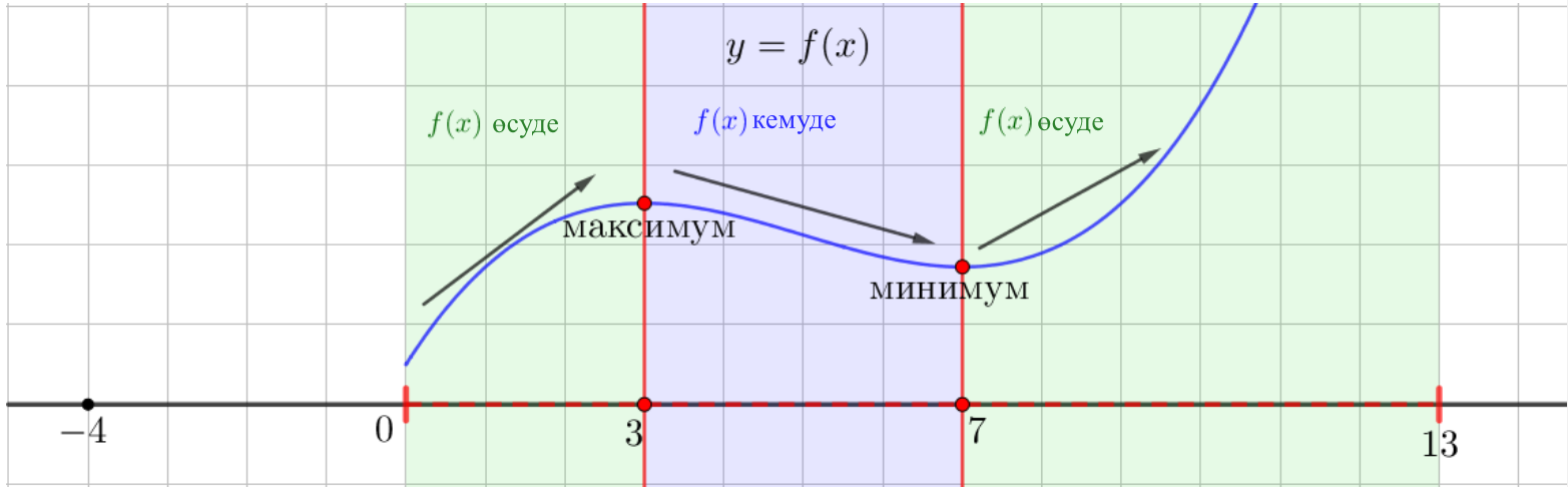 | \(\displaystyle (0;\,3){\small,}\) \(\displaystyle (7;\,13)\) | \(\displaystyle \color{green}{f^{\prime}(x)>0}\) | \(\displaystyle f(x)\) өсуде \(\displaystyle \color{green}{\nearrow}\) |