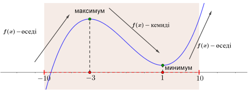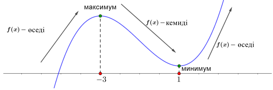 - \(\displaystyle \color{green}{(-\infty;\,-3)}\) және \(\displaystyle \textcolor{Purple}{\left(1;\, +\infty\right)}\) аралықтарында\(\displaystyle f^{\prime}(x)>0{\small,}\)