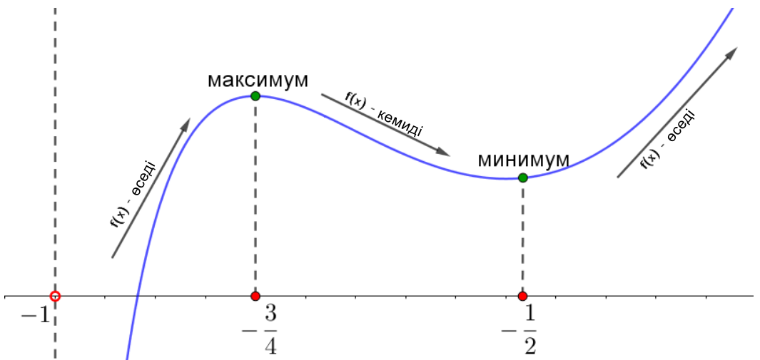 - \(\displaystyle \color{green}{\left(-1;\, -\frac{3}{4}\right)}\) және \(\displaystyle \color{Purple}{\left(-\frac{1}{2};\,+\infty\right)}\) аралықтарында \(\displaystyle f^{\prime}(x)>0{\small,}\)