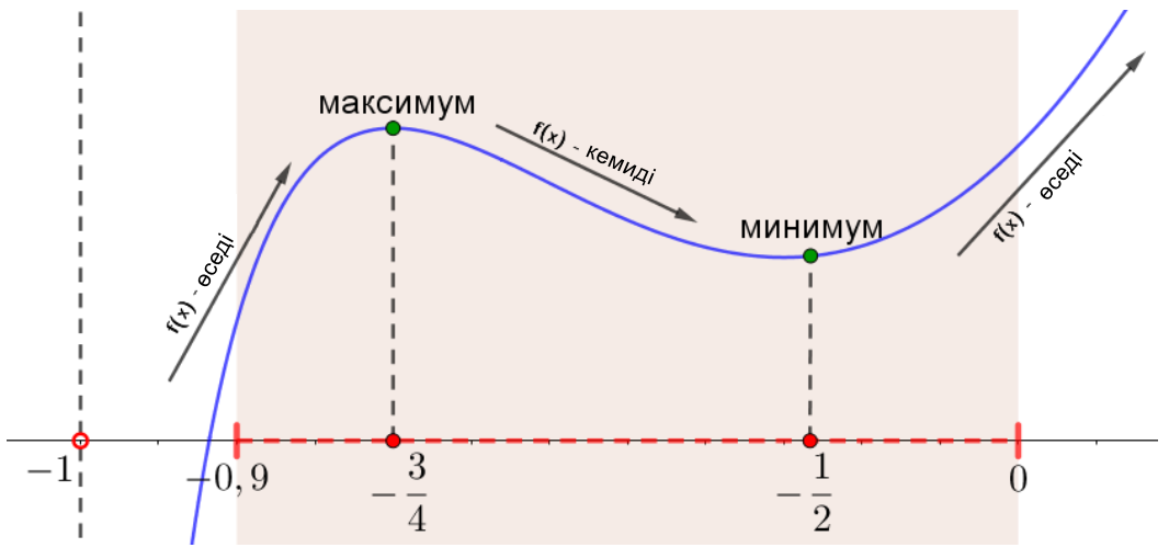 \(\displaystyle \left[-0{,}9;\,0\right]\) кесіндісінде \(\displaystyle f(x)\) функциясының максималды мәніне не максималды нүктеде \(\displaystyle \color{green}{x=-\frac{3}{4}}{ \small }\) немесе оң жағында \(\displaystyle \color{blue}{x=0}{\small }\) жететінін көруге болады