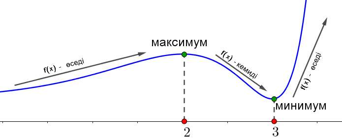 - \(\displaystyle \color{green}{(-\infty;\,2)}\) және \(\displaystyle \color{Purple}{(3;\,+\infty)}\) аралықтарында \(\displaystyle f^{\prime}(x)>0{\small,}\)
