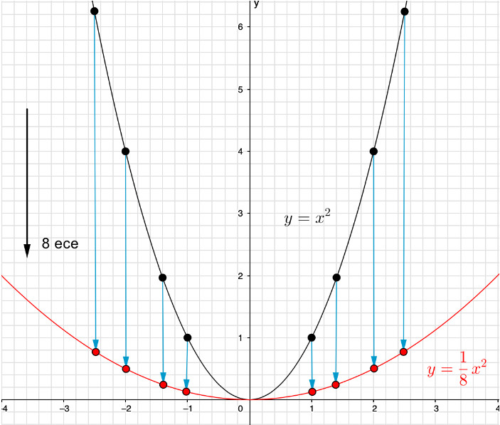 \(\displaystyle (x;\,x^2) { \small }\) түрінің әр нүктесімен осындай операция жасай отырып, \(\displaystyle y=\color{blue}{\frac{1}{8}}x^2{\small }\) параболасының графигі болып табылатын \(\displaystyle \{(x;\, \color{blue}{\frac{1}{8}}x^2) \}{ \small }\) нүктелерінің жиынын аламыз: