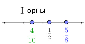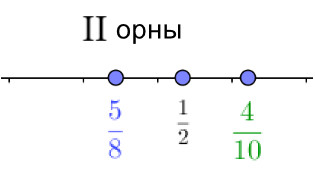 Осы теңсіздіктен сандардың солдан оңға қарай сандық осьтегі орналасуын аламыз: \(\displaystyle \frac{4}{10}{\small , }\,\,\frac{ 1}{ 2} \) және \(\displaystyle \frac{ 5}{ 8}{\small . } \)
