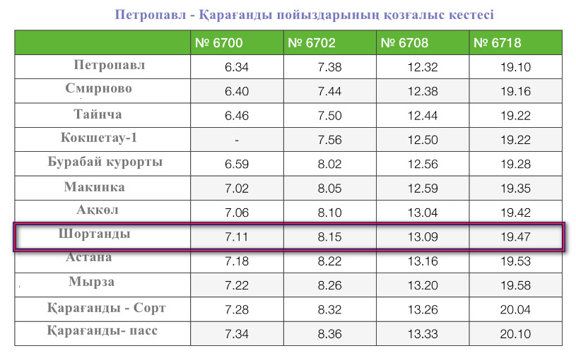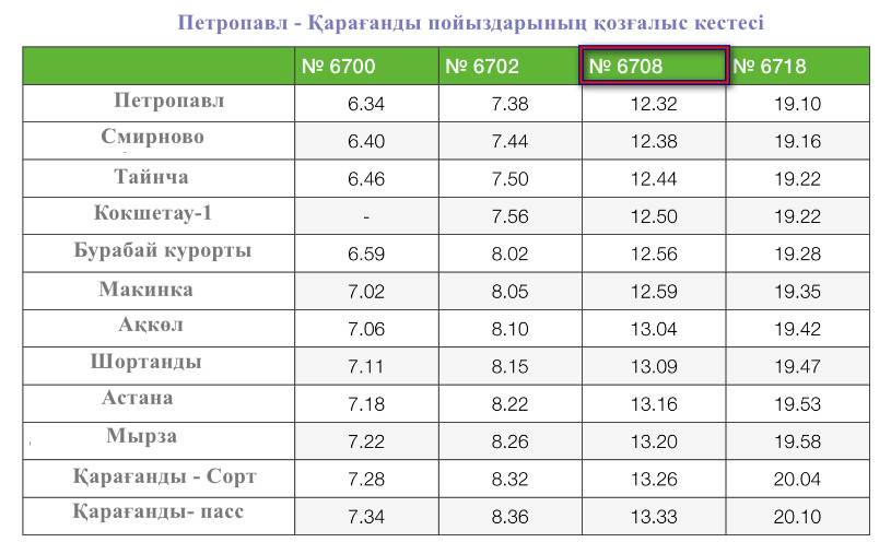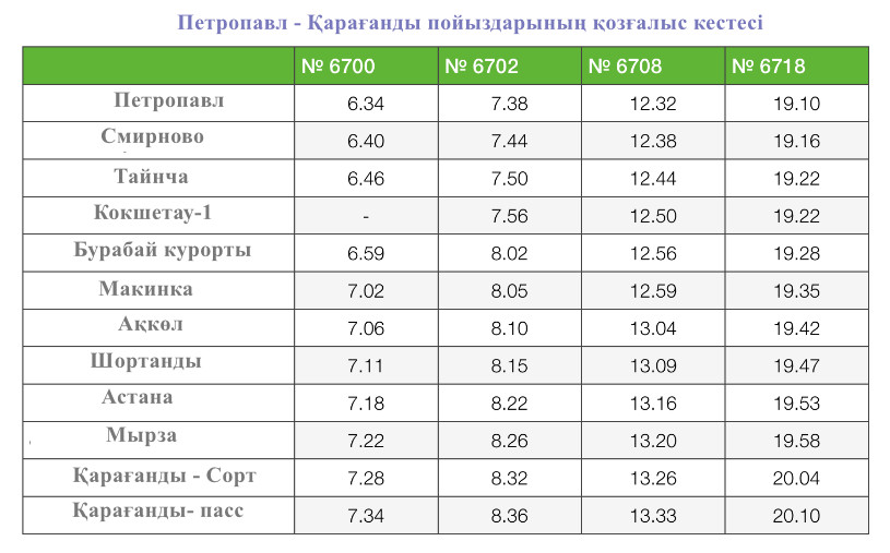 Петропавл-Қарағанды поездарының қозғалыс кестесі берілген: