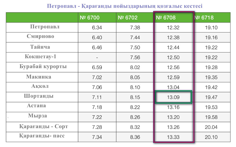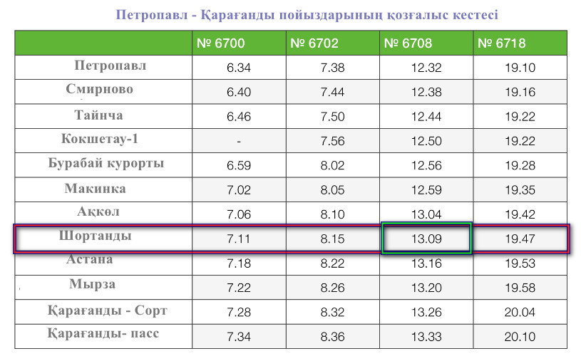 \(\displaystyle 13\) сағат \(\displaystyle 9\) минутта Шортанды кентіне қандай поезд келеді?