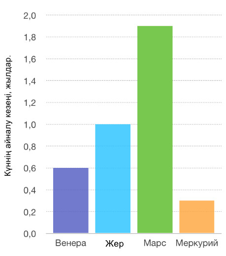 Диаграммадан Марс пен Меркурийдің Күнді айналып өту кезеңдері сәйкесінше \(\displaystyle 1{,}9\) жыл және \(\displaystyle 0,3\) жыл тең екенін көруге болады.