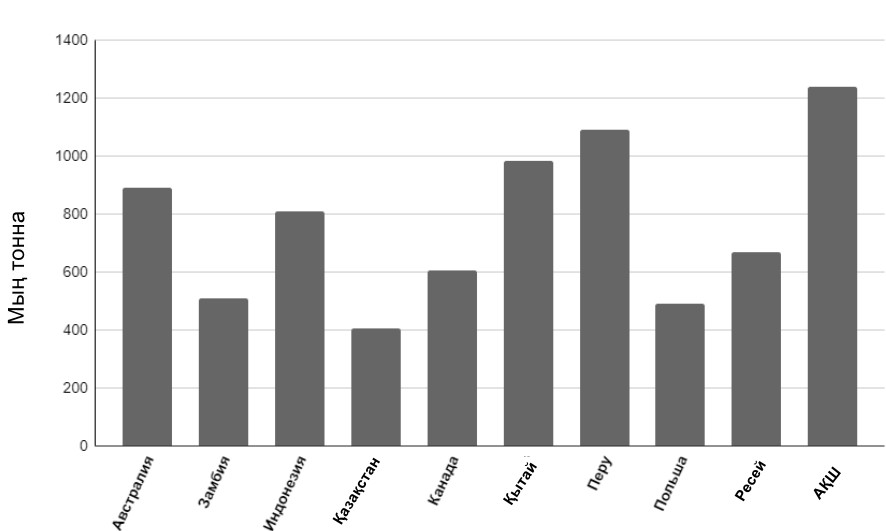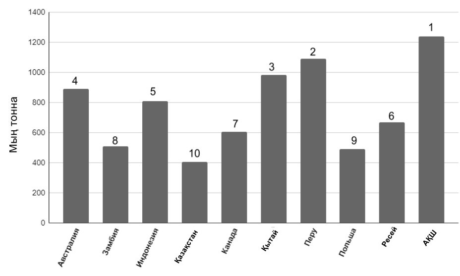 Диаграммада \(\displaystyle 2006\) жыл ішінде \(\displaystyle 10\) әлем елдерінде (мың тонна) мыс балқытудың таралуы көрсетілген. Ұсынылған елдер арасында Мыс балқыту бойынша бірінші орынды АҚШ, оныншы орынды Қазақстан иеленді. Канада қандай орын алды?