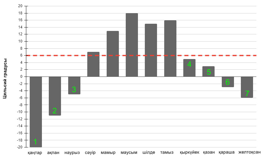 Диаграммада Экибастузда \(\displaystyle 2001\) жылдың әр айдағы ауаның орташа айлық температурасы көрсетілген. Көлденең айлар, ал тігінен температура градус Цельсий бойынша белгіленген. Диаграмма бойынша орташа айлық температура (6) градус Цельсийден қанша ай жоғары болмағанын анықтаңыз.