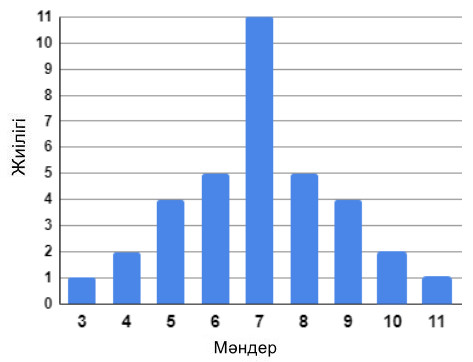 | Жиілік | \(\displaystyle 1\) | \(\displaystyle 2\) | \(\displaystyle 4\) | \(\displaystyle 5\) | \(\displaystyle 11\) | \(\displaystyle 5\) | \(\displaystyle 4\) | \(\displaystyle 2\) | \(\displaystyle 1\) | Сумма: \(\displaystyle 35\) |