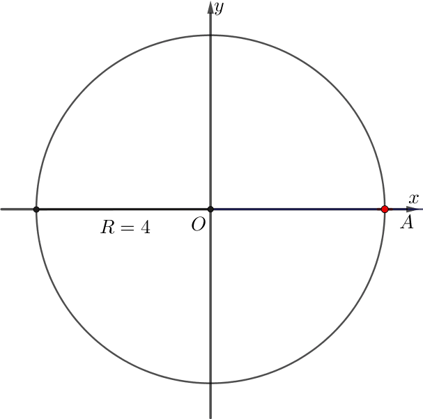 Луч \(\displaystyle OA\) повернулся на угол \(\displaystyle \alpha{\small.}\) Точка \(\displaystyle A\) все время двигалась по окружности радиуса \(\displaystyle R=4{\small.}\) Чему равен \(\displaystyle \alpha\) в радианах, если длина пути, пройденного точкой \(\displaystyle A{\small ,}\) равна \(\displaystyle 9\pi{\small?}\)