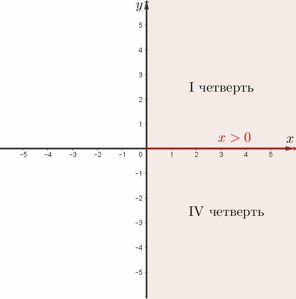 - \(\displaystyle x>0\) в первой и четвёртой четверти;