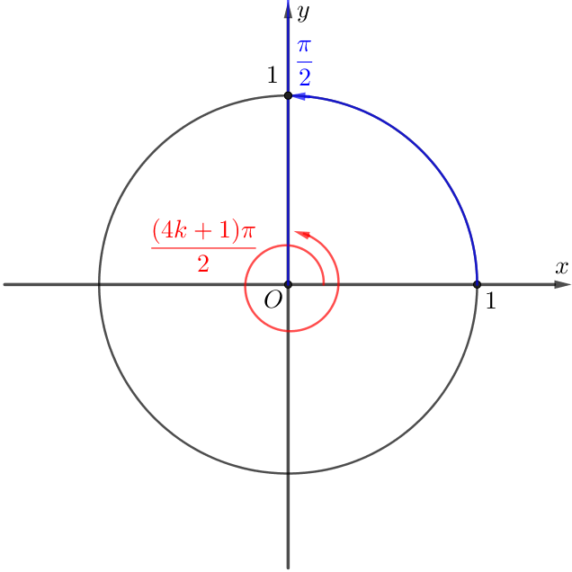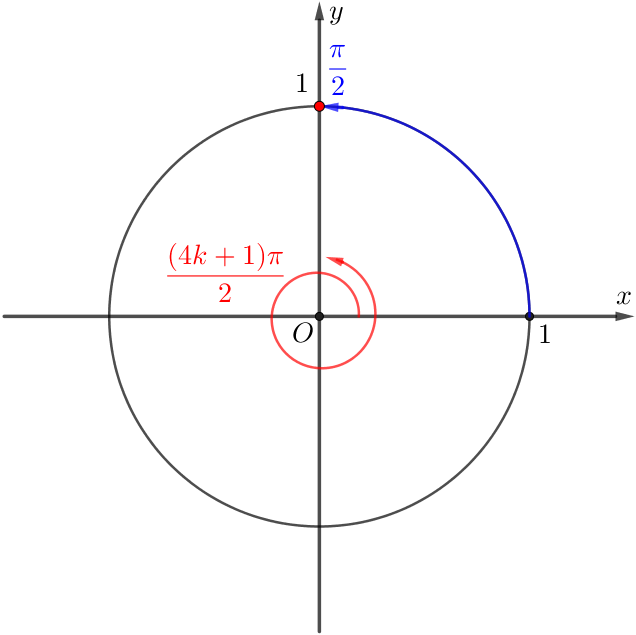Следовательно, угол \(\displaystyle \frac{(4k+1)\pi}{2}\) получается из угла \(\displaystyle \frac{\pi}{2}\) добавлением \(\displaystyle \color{red}{k}\) полных оборотов: