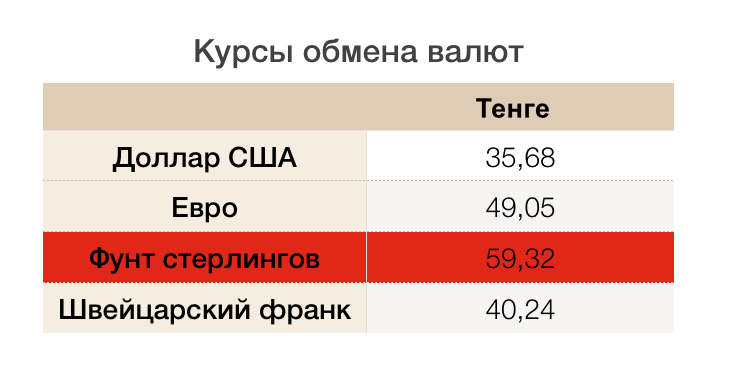 Согласно данной таблице, курс одного фунта стерлингов составляет \(\displaystyle 59{,}32\) тенге (\(\displaystyle 59\) тенге \(\displaystyle 32\) тиын):