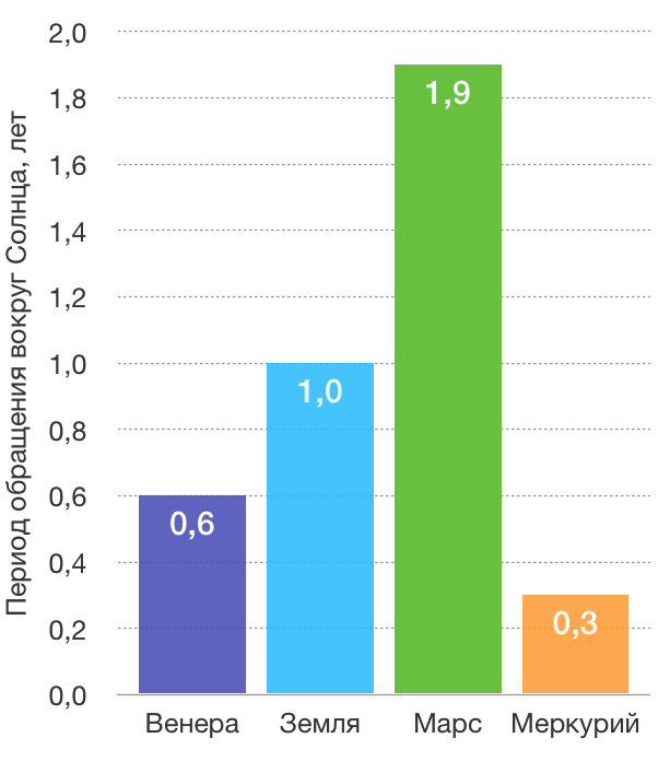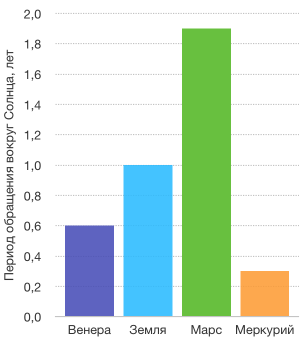 Из диаграммы видно, что периоды обращения Марса и Меркурия вокруг Солнца соответственно равны \(\displaystyle 1,9\) года и \(\displaystyle 0,3\) года.
